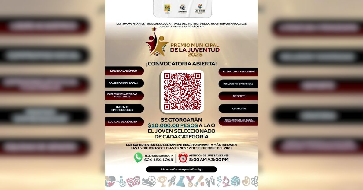 Los Cabos, Baja California Sur.- El XV Ayuntamiento de Los Cabos, a través del Instituto de la Juventud (Injuve), anunció la apertura de la convocatoria al Premio Municipal de la Juventud 2025, un reconocimiento que busca destacar el talento, esfuerzo y compromiso de las juventudes cabeñas de entre 12 y 29 años de edad.