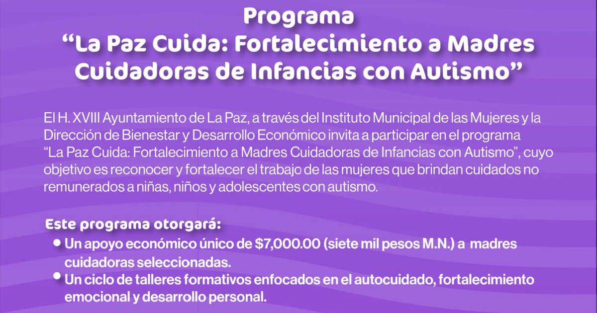 La Paz, Baja California Sur. Como parte de las acciones impulsadas para fortalecer el bienestar de las mujeres, el Instituto Municipal de las Mujeres (IMM) y la Dirección General de Bienestar y Desarrollo Económico convocaron a participar en el programa “La Paz Cuida: Fortalecimiento a Madres Cuidadoras de Infancias con Autismo”.