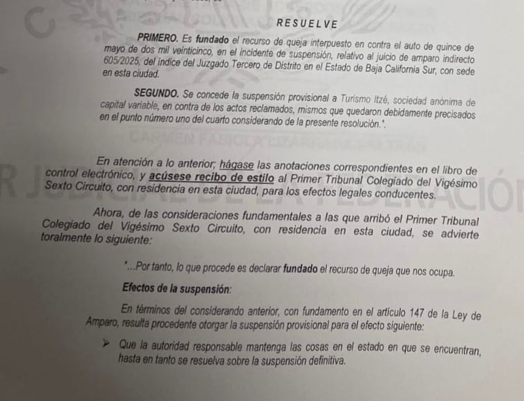 Dicho amparo recayó en el listado del Juzgado Tercero en materia mixta del Poder Judicial de la Federación en Baja California Sur (BCS). Ahí, el juez negó la suspensión del acto por lo que el representante legal de Turismo Itze de SA acudió al recurso de queja, mismo que se enlistó en el Primer Tribunal Colegiado de Circuito de BCS, en el que los magistrados resolvieron la queja y otorgando la suspensión a la empresa Turismo Itze de SA, esto se notificó desde el 22 de mayo al juez tercero de distrito, con esto Grupo Vidanta retoma la seguridad del camino que arbitrariamente se abrió por autoridades de diversos órdenes de gobierno.