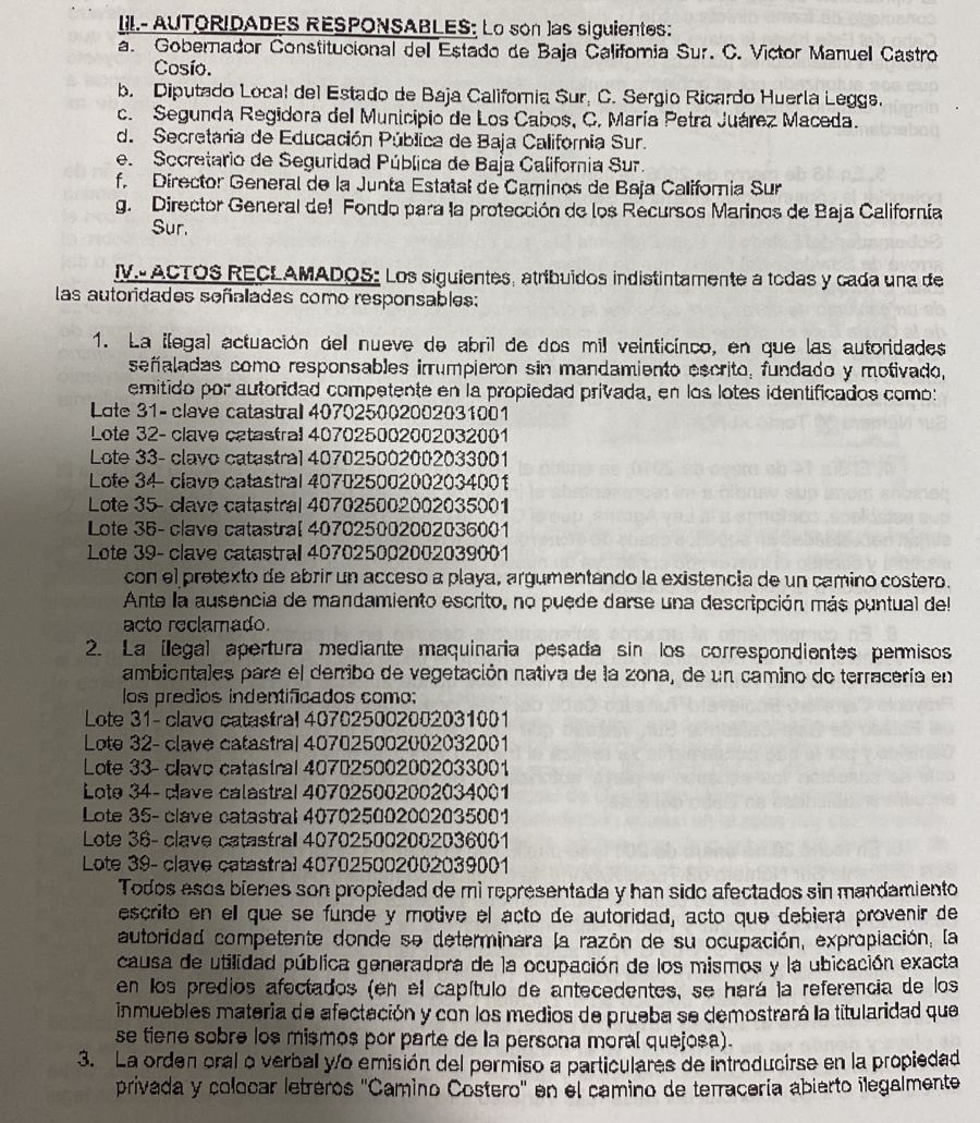 La empresa, afectada el 9 de abril consideró una ilegal actuación de las autoridades señaladas tras irrumpir sin mandamiento escrito, fundado y motivado emitido por autoridad competente en la propiedad privada del quejoso con el pretexto de recuperar un camino costero y abrir la prioridad privada al público en general.