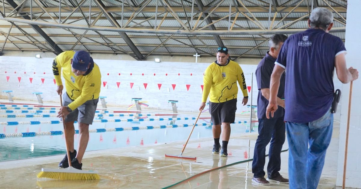 Los Cabos, Baja California Sur.- El director general del Instituto del Deporte del Municipio de Los Cabos (Indem), Elton Emmanuel Olachea Arce, acompañado por el subdirector del Deporte Patrick Rivera López y el coordinador de Cabo San Lucas David Rodríguez, llevó a cabo una intensa jornada de limpieza y rehabilitación en la Alberca Olímpica que se localiza en el centro deportivo Don Koll, al ser uno de los espacios que resultó con grandes afectaciones tras el paso del huracán Lorena.