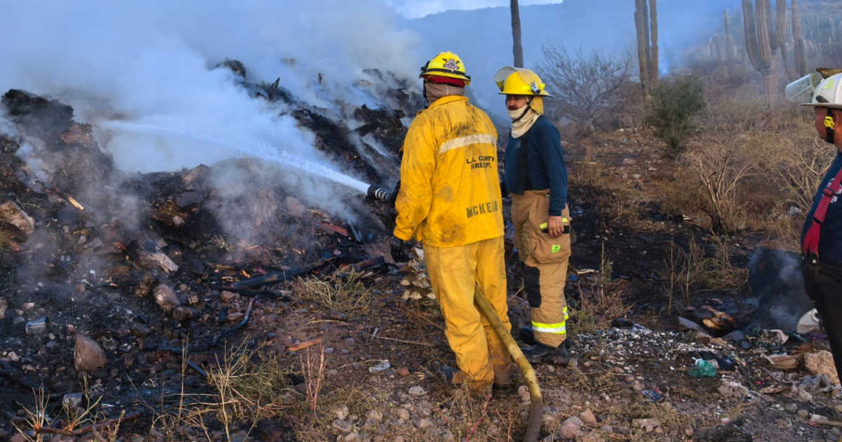 Loreto, Baja California Sur. La madrugada de este miércoles 3 de diciembre, elementos del cuerpo de bomberos en coordinación con autoridades de Protección Civil, activaron labores de atención, control y extinción de un fuerte incendio al interior del relleno sanitario al norte de Loreto.