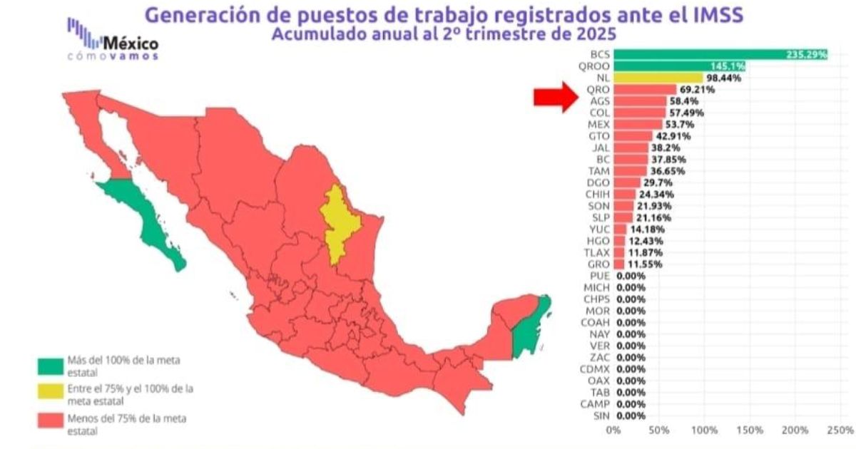 La Paz, Baja California Sur.- La organización México, ¿Cómo Vamos?, que utiliza el registro de empleos formales ante el Instituto Mexicano del Seguro Social (IMSS) como indicador principal para evaluar el desempeño económico y metas de crecimiento de las entidades federativas, informó que Baja California Sur superó ampliamente su meta de generación de empleo formal al primer semestre de 2025.