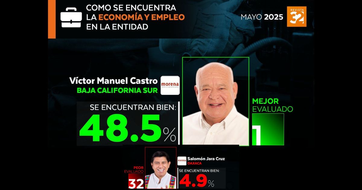 Los Cabos, Baja California Sur.- De acuerdo con la más reciente medición nacional correspondiente a mayo de 2025, el gobernador de Baja California Sur, Víctor Manuel Castro Cosío, se posiciona como el mejor evaluado del país en materia de economía y empleo. Con un 48.5% de aprobación ciudadana, encabeza el listado de los 32 mandatarios estatales evaluados por Revista 32.
